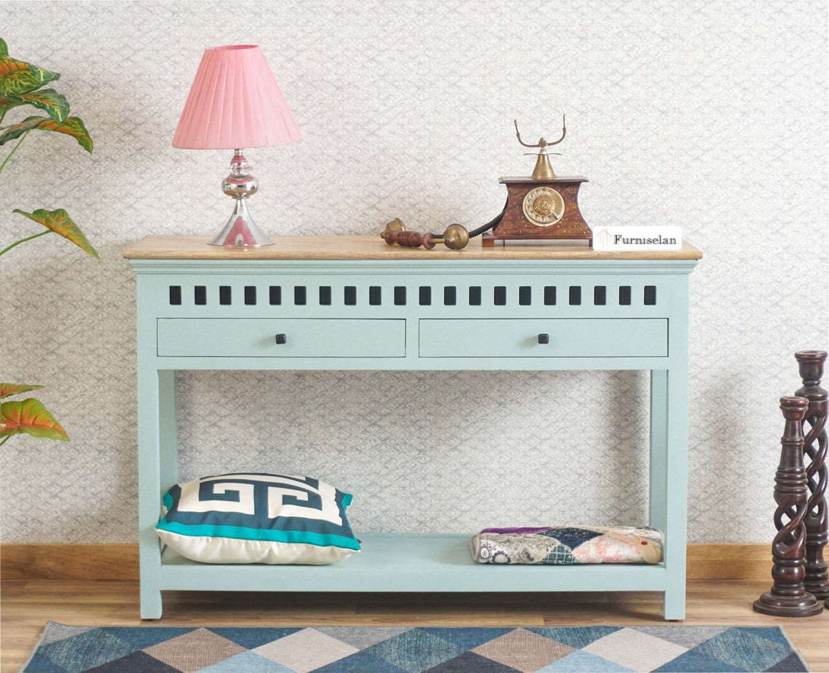 Alexandria Solid Wood Console Table-Two Drawer is a perfect solid wood Console Table. Use of Mango Wood as primary material gives this Console Table a solid & sturdy look. Secondary material is used as MDF on the Side and Drawer Bottom. We offer free country-wide shipping and free installation service. The wood used in the furniture is perfectly seasoned for optimum moisture content, to reduce the possibility of seasonal expansion or contraction of the products.