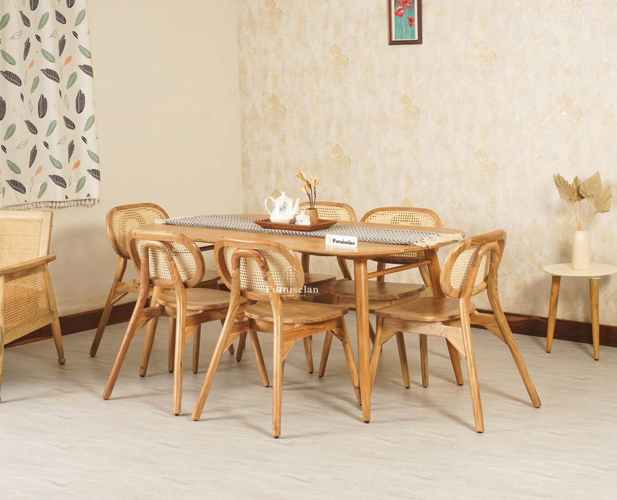 Antilia Solid Wood Six Seater Dining set with Six Chairs is a perfect solid wood Dining Set. Use of Acacia Wood as primary material gives this Dining Set a solid & sturdy look. Secondary material is used as Rattan Cane. We offer free country-wide shipping and free installation service. The wood used in the furniture is perfectly seasoned for optimum moisture content, to reduce the possibility of seasonal expansion or contraction of the products.