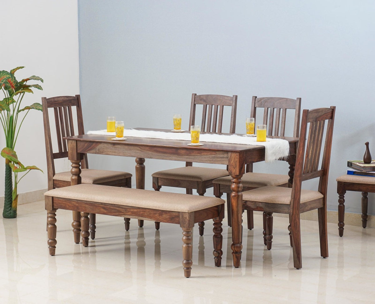 Belgium 6 Seater Dining Set With 4 Chairs & Bench is a perfect solid wood Dining Set. Use of Sheesham Wood as primary material gives this Dining Set a solid & sturdy look. Secondary material is used as Foam& Fabric-used at Seat. We offer free country-wide shipping and free installation service. The wood used in the furniture is perfectly seasoned for optimum moisture content, to reduce the possibility of seasonal expansion or contraction of the products.