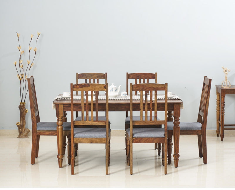 Belgium 6 Seater Dining Set With 6 Chairs is a perfect solid wood Dining Set. Use of Sheesham Wood as primary material gives this Dining Set a solid & sturdy look. Secondary material is used as Foam& Fabric-used at Seat. We offer free country-wide shipping and free installation service. The wood used in the furniture is perfectly seasoned for optimum moisture content, to reduce the possibility of seasonal expansion or contraction of the products.