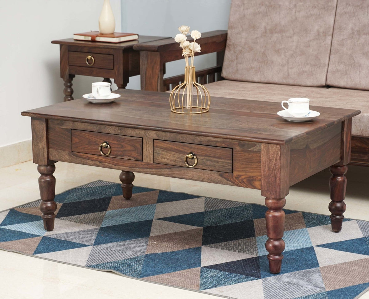 Storage: Belgium Sheesham Wood Two Drawer Coffee Table comes with storage option.