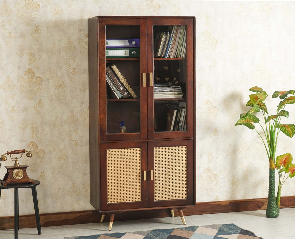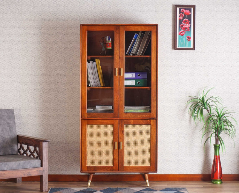 Boston Solid Wood Four Door Bookshelf is a perfect solid wood Bookshelf. Use of Mango Wood as primary material gives this Bookshelf a solid & sturdy look. Secondary material is used as Rattan Cane/MDF is used in the Backside and Glass on Door. We offer free country-wide shipping and free installation service. The wood used in the furniture is perfectly seasoned for optimum moisture content, to reduce the possibility of seasonal expansion or contraction of the products.