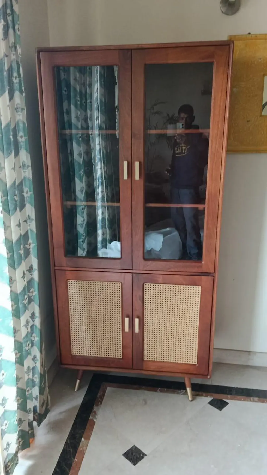 Material: Primary - Mango Wood, Secondary - Rattan Cane/MDF is used in the Backside and Glass on Door