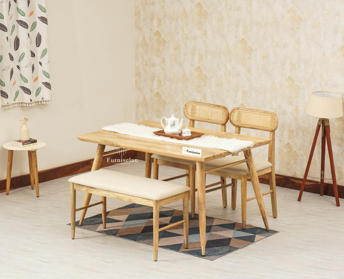 Boston Solid Wood Rattan Cane Dining Table Four Seater with Bench is a perfect solid wood Dining Set. Use of Mango Wood as primary material gives this Dining Set a solid & sturdy look. Secondary material is used as Rattan Cane & Fabrics(Used in Seat). We offer free country-wide shipping and free installation service. The wood used in the furniture is perfectly seasoned for optimum moisture content, to reduce the possibility of seasonal expansion or contraction of the products.