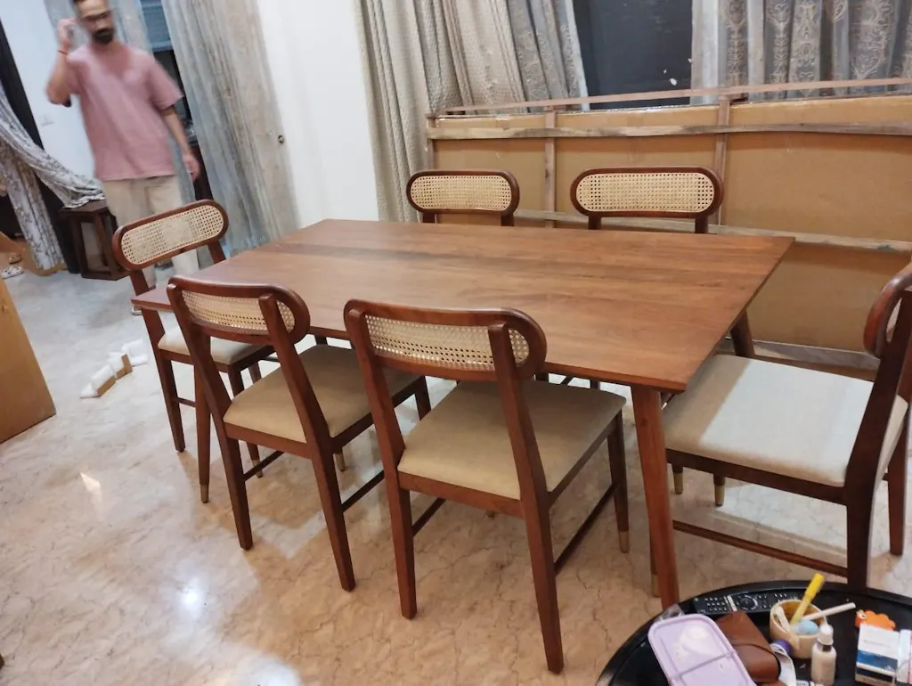 Boston Solid Wood Rattan Cane Dining Table Six Seater Set is a perfect solid wood Dining Set. Use of Mango Wood as primary material gives this Dining Set a solid & sturdy look. Secondary material is used as Rattan Cane & Fabrics(Used in Seat). We offer free country-wide shipping and free installation service. The wood used in the furniture is perfectly seasoned for optimum moisture content, to reduce the possibility of seasonal expansion or contraction of the products.