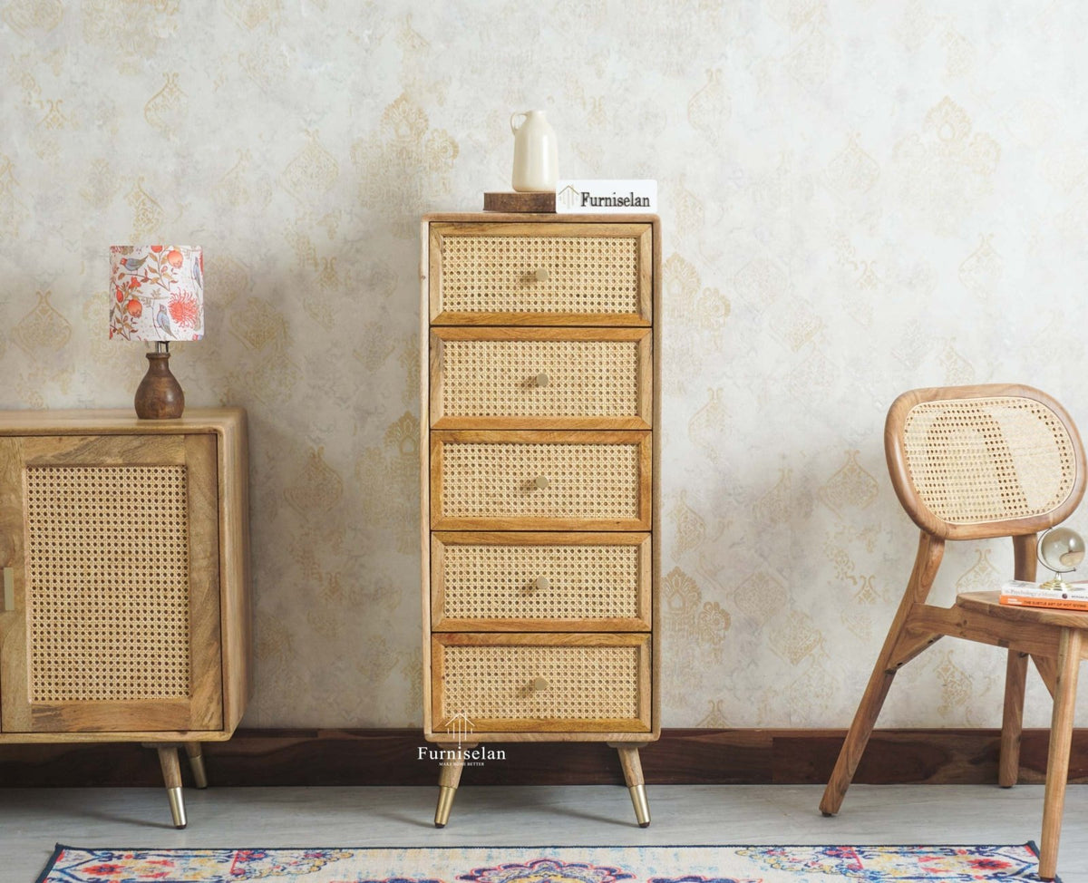 Storage: Boston Solid Wood Rattan Cane Tall Chest of Drawer Five Drawer comes with Five Drawer storage option.