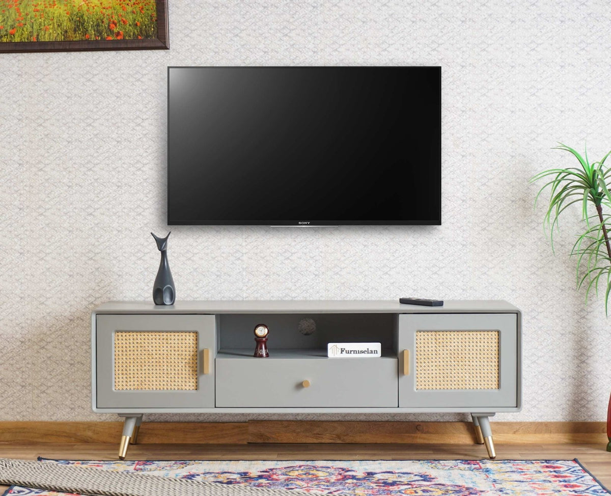 Boston Solid Wood Rattan Cane Tv Cabinet - (Cool Grey)