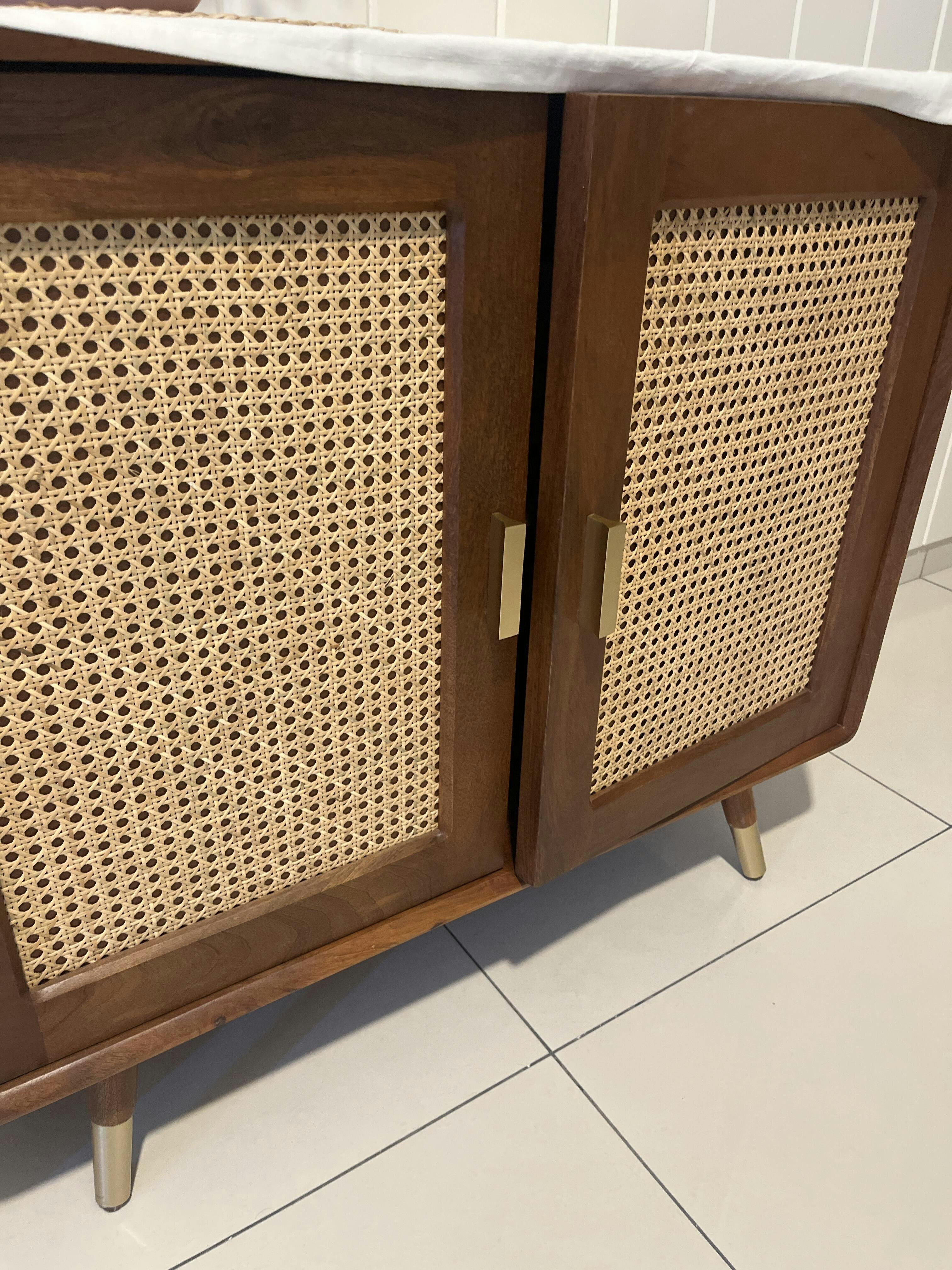 Boston Solid Wood Rattan Cane Two Door Sideboard Cabinet is a perfect solid wood Sideboard. Use of Mango Wood as primary material gives this Sideboard a solid & sturdy look. Secondary material is used as Rattan Cane/MDF is used in the Backside. We offer free country-wide shipping and free installation service. The wood used in the furniture is perfectly seasoned for optimum moisture content, to reduce the possibility of seasonal expansion or contraction of the products.