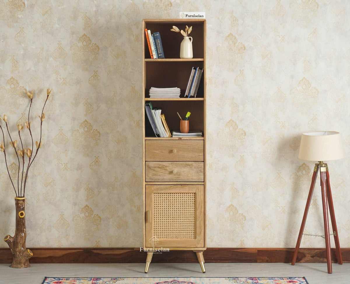 Boston Solid Wood Tall Bookshelf Unit File Rack is a perfect solid wood Bookshelf. Use of Mango Wood as primary material gives this Bookshelf a solid & sturdy look. Secondary material is used as Rattan Cane/MDF is used in the Backside and Glass on Door. We offer free country-wide shipping and free installation service. The wood used in the furniture is perfectly seasoned for optimum moisture content, to reduce the possibility of seasonal expansion or contraction of the products.