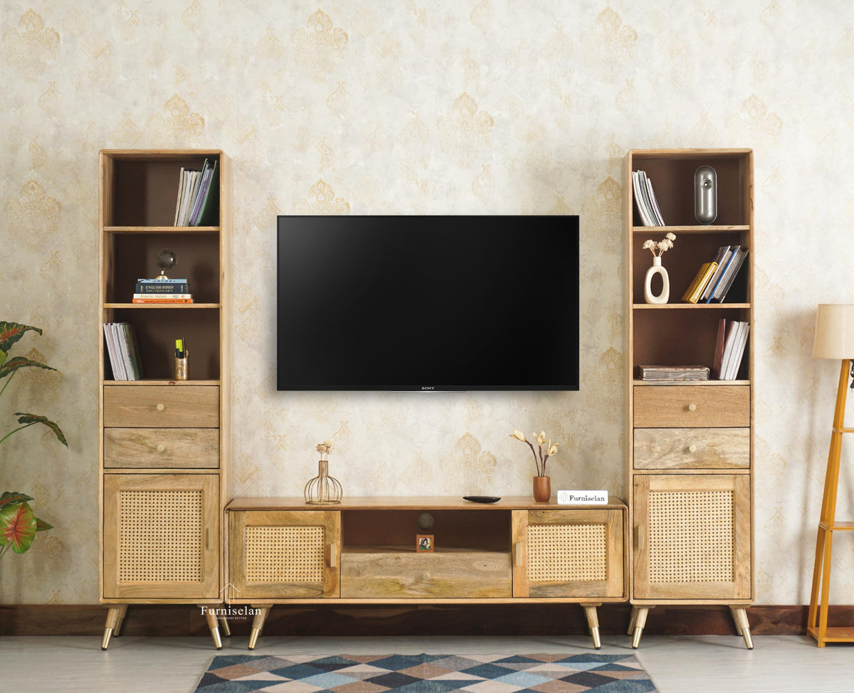 Boston Solid Wood Tv Entertainment Unit Set Of Three Cabinets is a perfect solid wood Tv Cabinet. Use of Mango Wood as primary material gives this Tv Cabinet a solid & sturdy look. Secondary material is used as Rattan Cane/MDF is used in the Drawer Bottom & Backside. We offer free country-wide shipping and free installation service. The wood used in the furniture is perfectly seasoned for optimum moisture content, to reduce the possibility of seasonal expansion or contraction of the products.