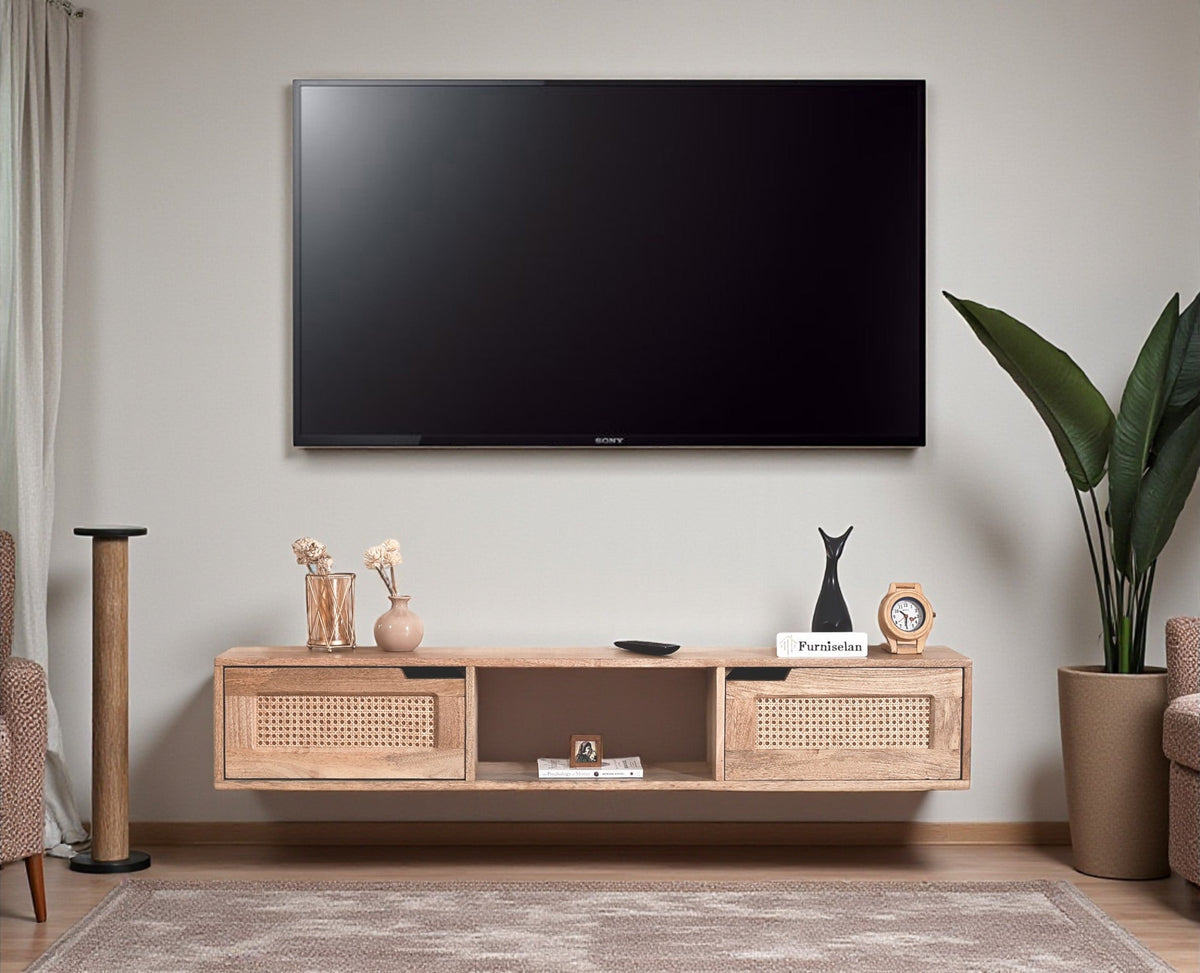 Boston Solid Wood Wall Mounted TV Unit Cabinet is a perfect solid wood Tv Cabinet. Use of Mango Wood as primary material gives this Tv Cabinet a solid & sturdy look. Secondary material is used as Rattan Cane. We offer free country-wide shipping and free installation service. The wood used in the furniture is perfectly seasoned for optimum moisture content, to reduce the possibility of seasonal expansion or contraction of the products.