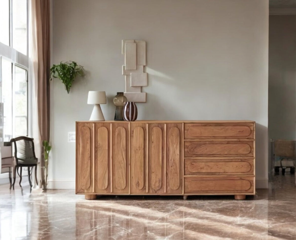 Chicago Solid Wood Two Door Three drawer Storage Cabinet is a perfect solid wood Tv Cabinet. Use of Acacia Wood as primary material gives this Tv Cabinet a solid & sturdy look. Secondary material is used as MDF is used in the Backside and Drawer Bottom. We offer free country-wide shipping and free installation service. The wood used in the furniture is perfectly seasoned for optimum moisture content, to reduce the possibility of seasonal expansion or contraction of the products.