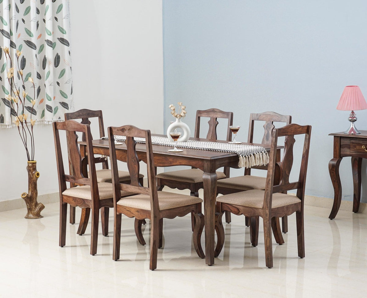Denmark 6 Seater Dining Set With 6 Chairs is a perfect solid wood . Use of Sheesham Wood as primary material gives this a solid & sturdy look. Secondary material is used as Foam& Fabric-used at Seat. We offer free country-wide shipping and free installation service. The wood used in the furniture is perfectly seasoned for optimum moisture content, to reduce the possibility of seasonal expansion or contraction of the products.