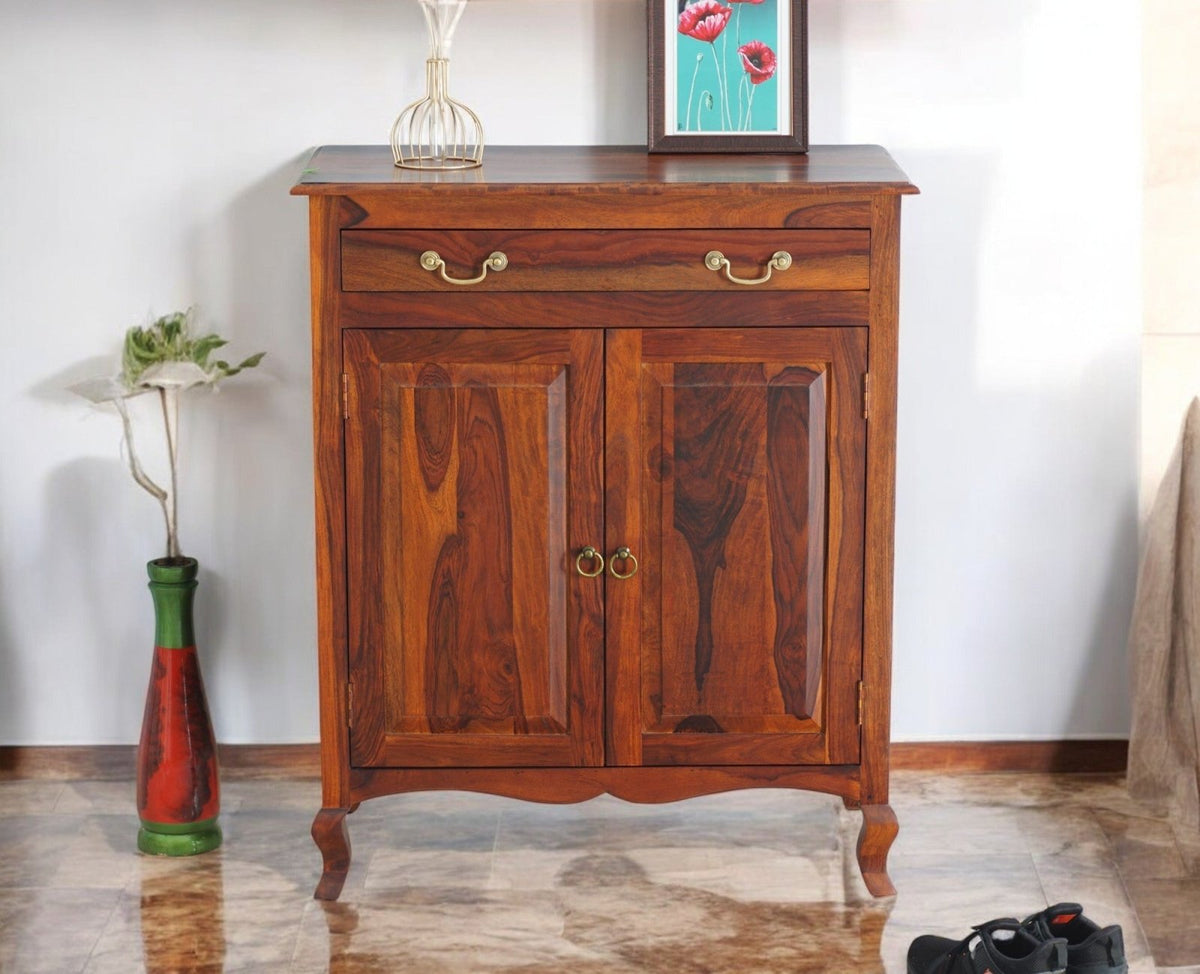 Denmark Sheesham Wood Shoe Rack is a perfect solid wood . Use of Sheesham Wood as primary material gives this a solid & sturdy look. Secondary material is used as MDF is used in the Drawer Bottom & Backside. We offer free country-wide shipping and free installation service. The wood used in the furniture is perfectly seasoned for optimum moisture content, to reduce the possibility of seasonal expansion or contraction of the products.