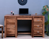 Mirzapur Solid Wood Writing Study Table, Study Laptop Desk with Three Drawers, & One Door is a perfect solid wood Study Table. Use of Sheesham Wood as primary material gives this Study Table a solid & sturdy look. Secondary material is used as MDF is used in the Drawer Bottom & Backside. We offer free country-wide shipping and free installation service. The wood used in the furniture is perfectly seasoned for optimum moisture content, to reduce the possibility of seasonal expansion or contraction of the products.