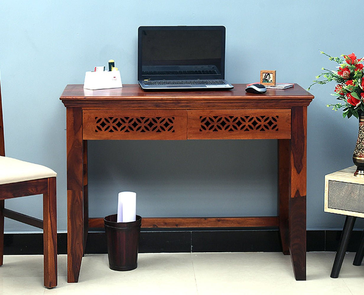 Dakar Solid Wood Study Table with Two Drawer is a perfect solid wood Study Table. Use of Sheesham Wood as primary material gives this Study Table a solid & sturdy look. Secondary material is used as MDF is used in the Drawer Bottom. We offer free country-wide shipping and free installation service. The wood used in the furniture is perfectly seasoned for optimum moisture content, to reduce the possibility of seasonal expansion or contraction of the products.