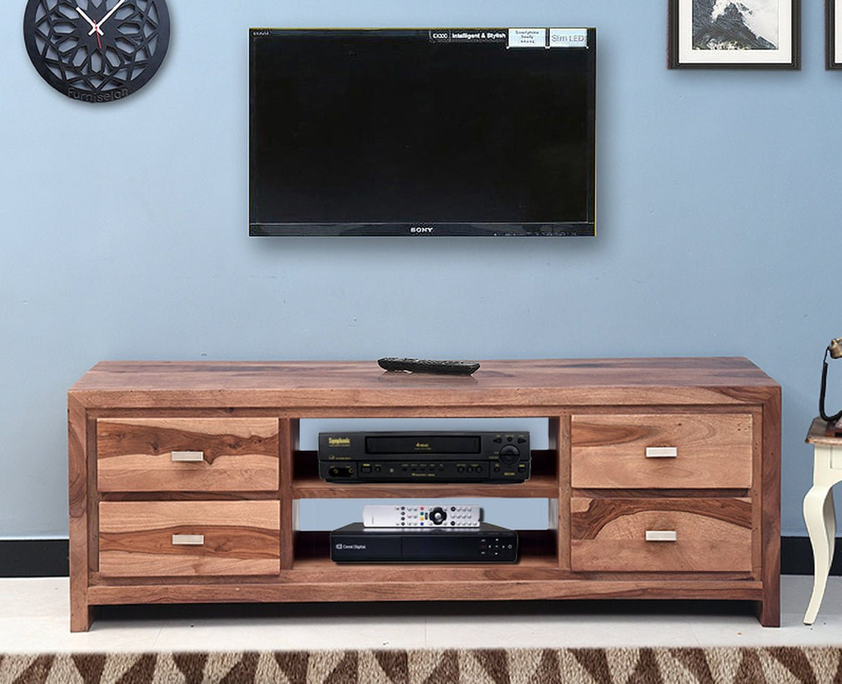 Hamburg Solid Wood Four Drawers Tv Cabinet-Rustic Teak Finish is a perfect solid wood Tv Cabinet. Use of Sheesham Wood as primary material gives this Tv Cabinet a solid & sturdy look. Secondary material is used as MDF is used in the Drawer Bottom & Backside. We offer free country-wide shipping and free installation service. The wood used in the furniture is perfectly seasoned for optimum moisture content, to reduce the possibility of seasonal expansion or contraction of the products.