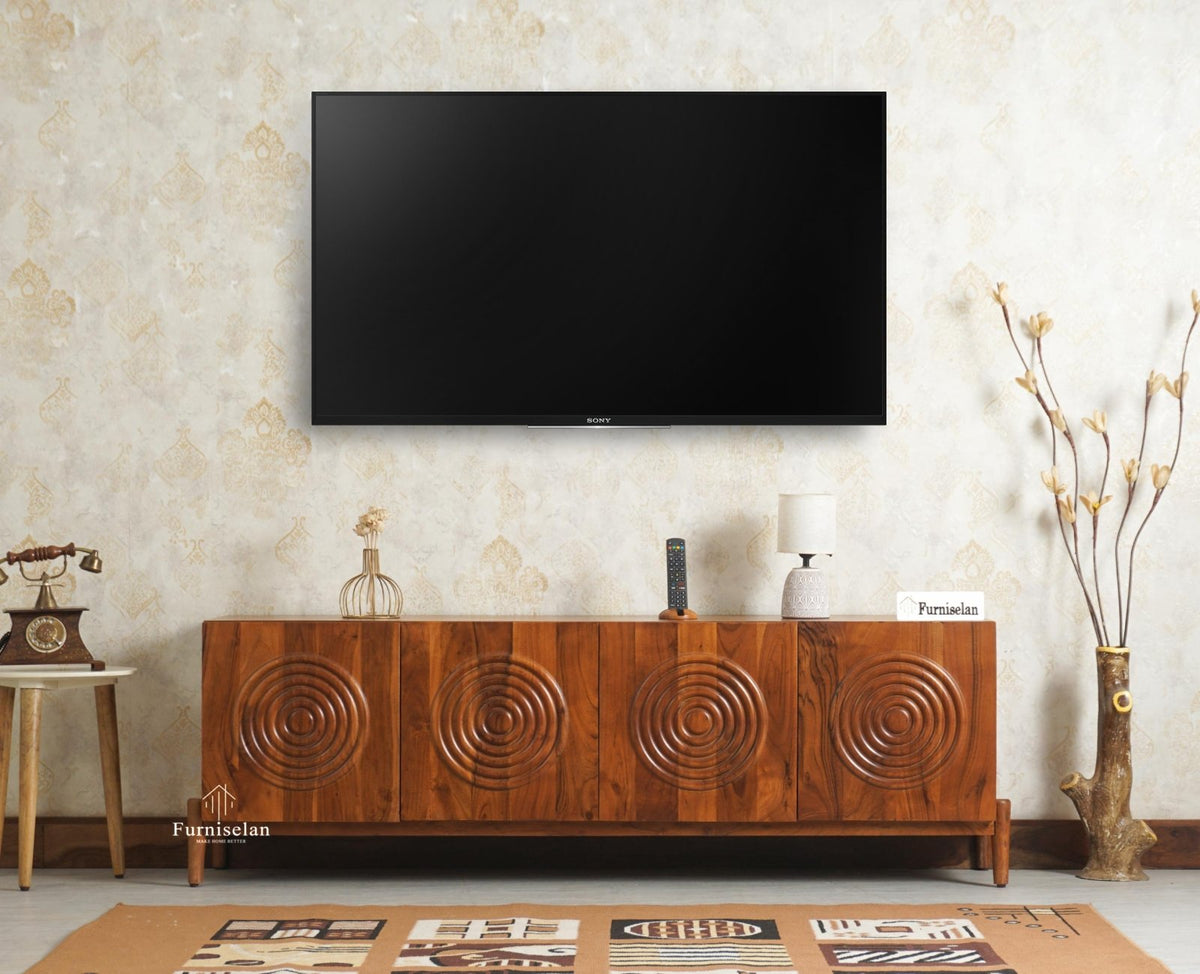 Italy Prime Solid Wood Four Door TV Cabinet Unit is a perfect solid wood Tv Cabinet. Use of Acaica Wood as primary material gives this Tv Cabinet a solid & sturdy look. Secondary material is used as MDF is used at Backside. We offer free country-wide shipping and free installation service. The wood used in the furniture is perfectly seasoned for optimum moisture content, to reduce the possibility of seasonal expansion or contraction of the products.