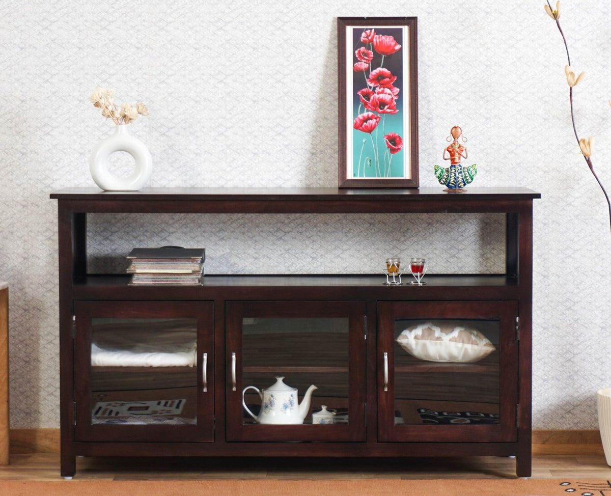 Kozhikode Sheesham Wood Three Door Kitchen Crockery Cabinet is a perfect solid wood Tv Cabinet. Use of Sheesham Wood as primary material gives this Tv Cabinet a solid & sturdy look. Secondary material is used as MDF on Back Side & Glass. We offer free country-wide shipping and free installation service. The wood used in the furniture is perfectly seasoned for optimum moisture content, to reduce the possibility of seasonal expansion or contraction of the products.