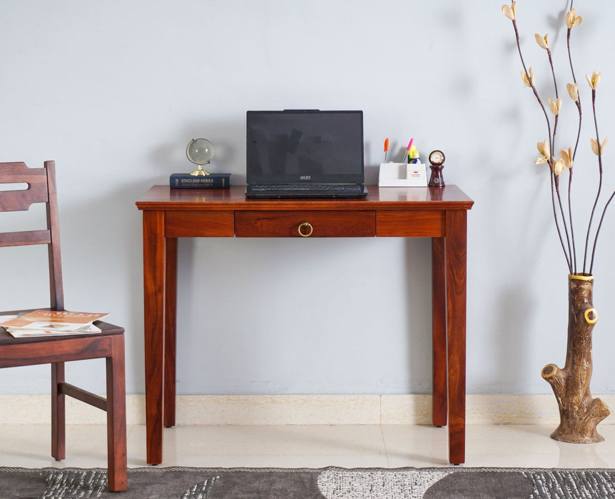 Raipur Study Table with one Drawer is a perfect solid wood Study Table. Use of Acacia Wood as primary material gives this Study Table a solid & sturdy look. Secondary material is used as MDF is used in the Drawer Bottom. We offer free country-wide shipping and free installation service. The wood used in the furniture is perfectly seasoned for optimum moisture content, to reduce the possibility of seasonal expansion or contraction of the products.