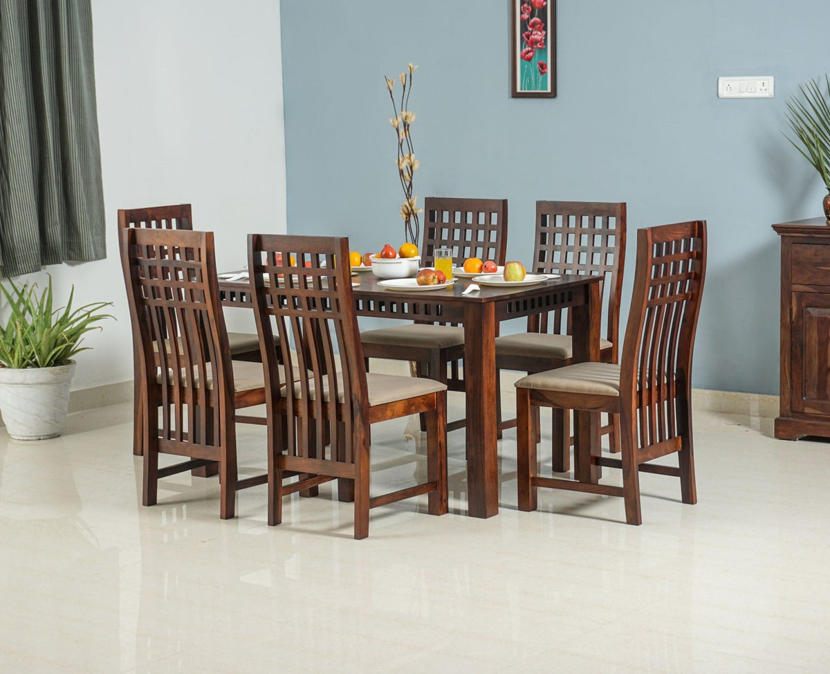 Oslo Sheesham Wood 6 Seater Dining Table Set with 6 Chair for Dining Room is a perfect solid wood Dining Set. Use of Sheesham Wood as primary material gives this Dining Set a solid & sturdy look. Secondary material is used as Foam and Fabric-used on Chair's Seat. We offer free country-wide shipping and free installation service. The wood used in the furniture is perfectly seasoned for optimum moisture content, to reduce the possibility of seasonal expansion or contraction of the products.