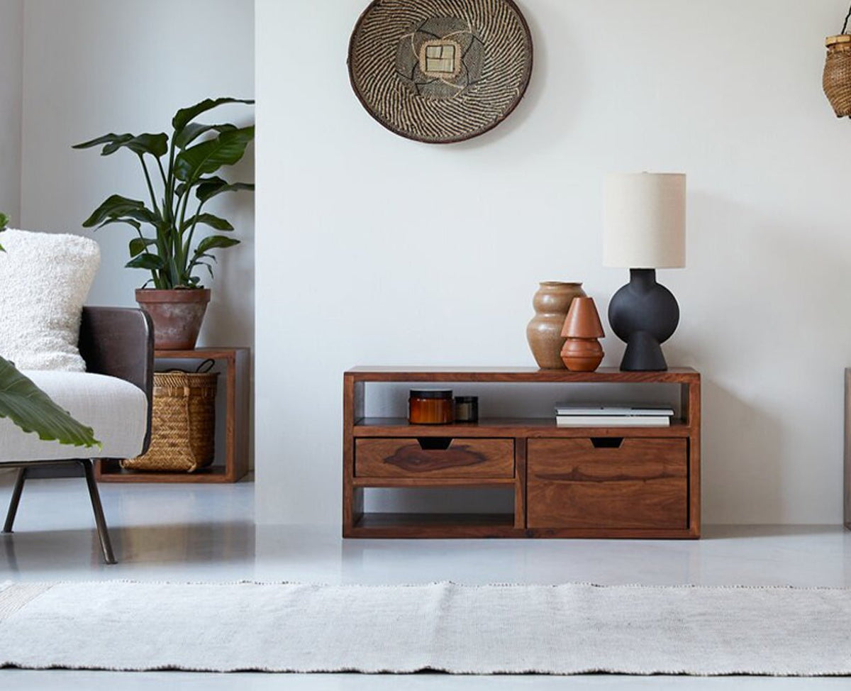 Sidon TV Cabinet Unit is a perfect solid wood Tv Cabinet. Use of Sheesham Wood as primary material gives this Tv Cabinet a solid & sturdy look. Secondary material is used as MDF is used in the Drawer Bottom. We offer free country-wide shipping and free installation service. The wood used in the furniture is perfectly seasoned for optimum moisture content, to reduce the possibility of seasonal expansion or contraction of the products.