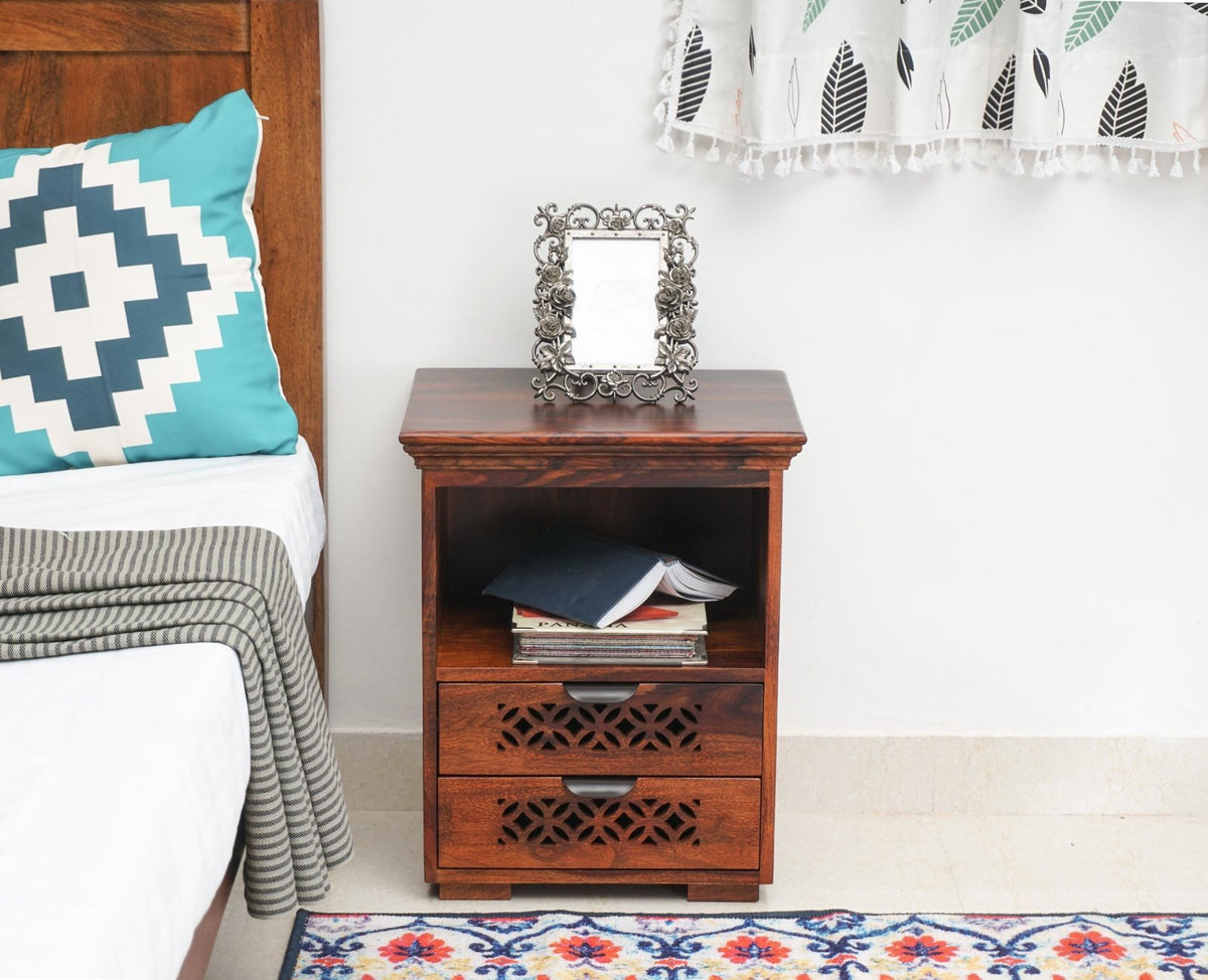 Rome Solid Two Drawer Bedside Table with open Shelve is a perfect solid wood Bedside Table. Use of Sheesham Wood as primary material gives this Bedside Table a solid & sturdy look. Secondary material is used as MDF is used in the Drawer Bottom & Backside. We offer free country-wide shipping and free installation service. The wood used in the furniture is perfectly seasoned for optimum moisture content, to reduce the possibility of seasonal expansion or contraction of the products.