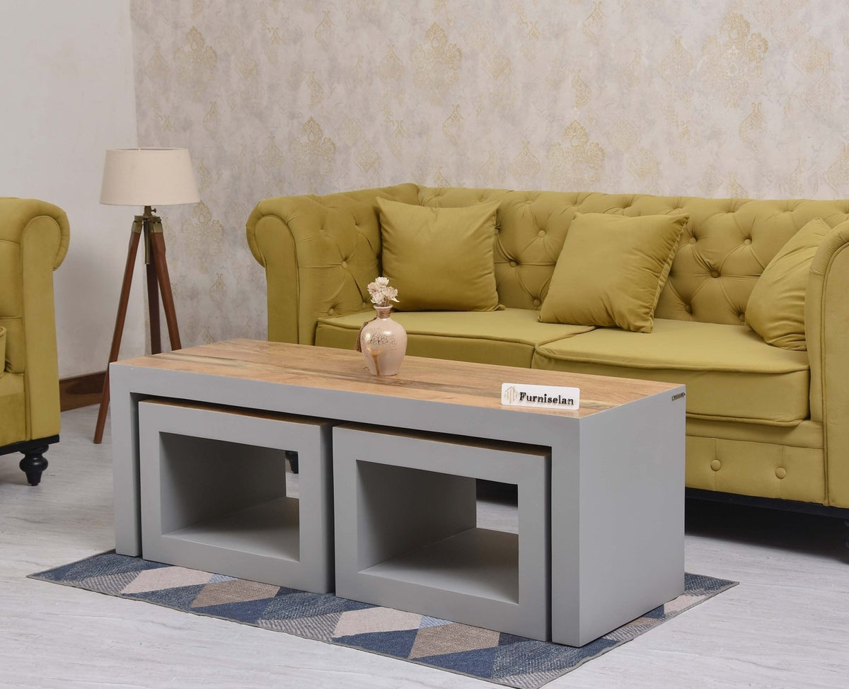 Storage: Portugal Solid Wood Coffee Table With Two Stool comes with storage option.