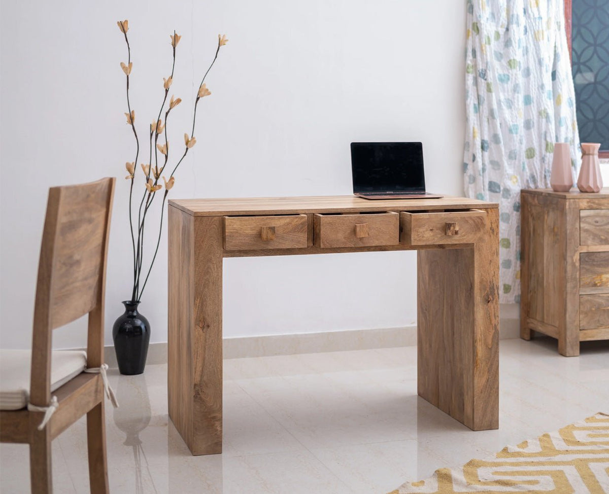 Portugal Solid Wood Three Drawer Console Table is a perfect solid wood Console Table. Use of Mango Wood as primary material gives this Console Table a solid & sturdy look. We offer free country-wide shipping and free installation service. The wood used in the furniture is perfectly seasoned for optimum moisture content, to reduce the possibility of seasonal expansion or contraction of the products.