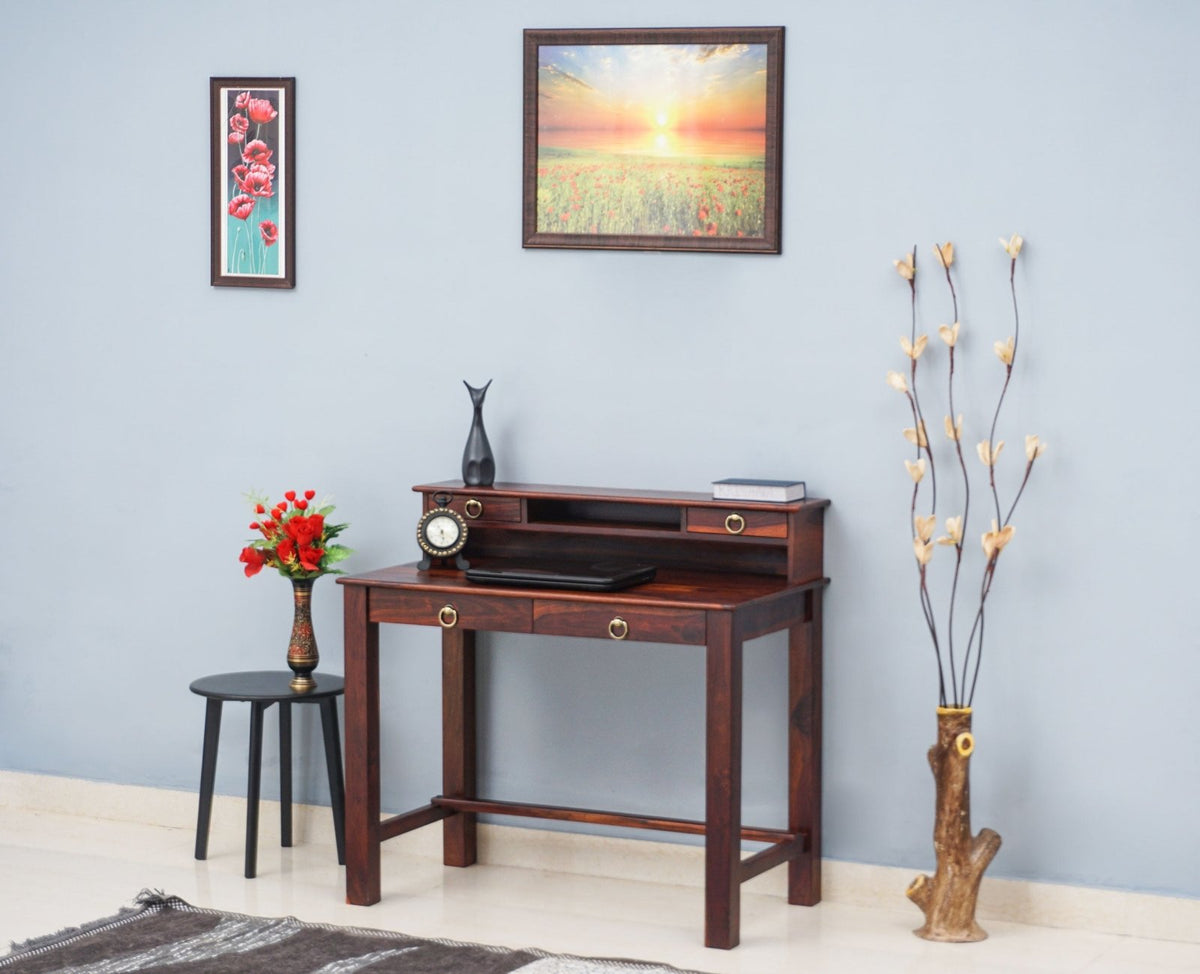 Oslo Solid Wood Study Table with Four Drawer is a perfect solid wood Study Table. Use of Sheesham Wood as primary material gives this Study Table a solid & sturdy look. Secondary material is used as MDF is used in the Drawer Bottom. We offer free country-wide shipping and free installation service. The wood used in the furniture is perfectly seasoned for optimum moisture content, to reduce the possibility of seasonal expansion or contraction of the products.