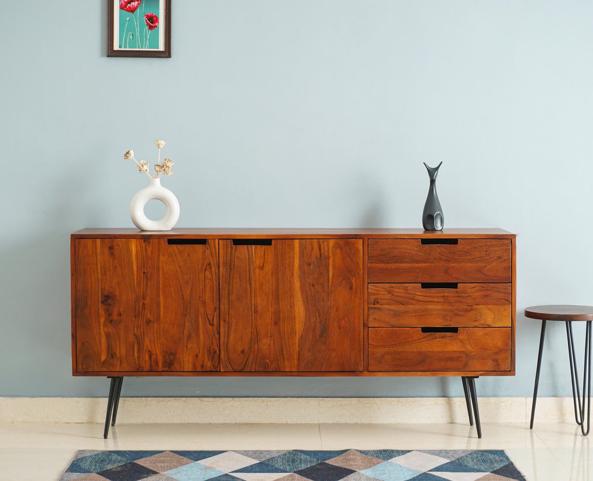 Vienna Solid Wood Three Drawer Two Door Sideboard is a perfect solid wood Sideboard. Use of Acacia Wood as primary material gives this Sideboard a solid & sturdy look. Secondary material is used as Powder Coated Metal Legs and MDF is used in the Backside & Drawer Bottom. We offer free country-wide shipping and free installation service. The wood used in the furniture is perfectly seasoned for optimum moisture content, to reduce the possibility of seasonal expansion or contraction of the products.