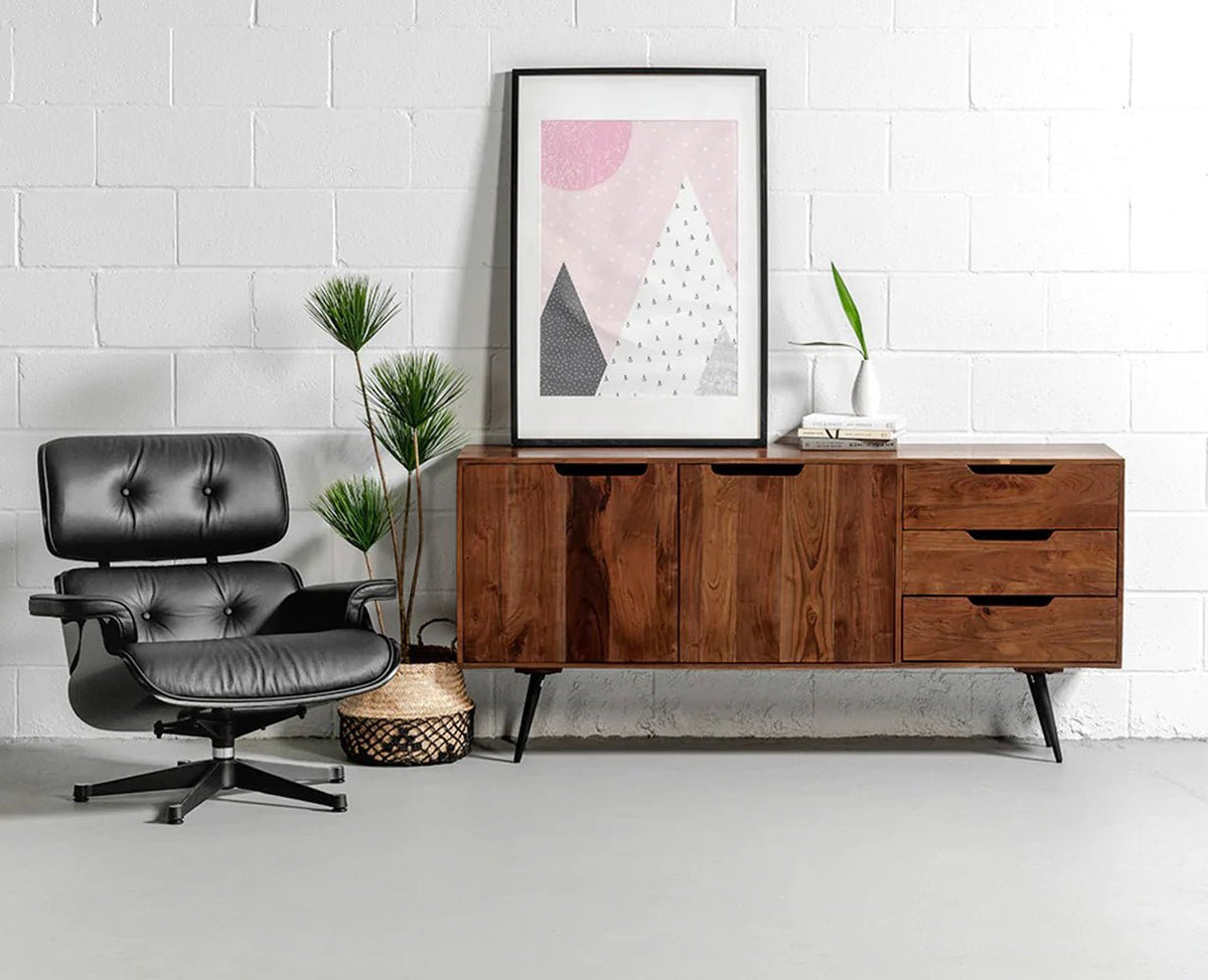 Vienna Solid Wood Three Drawer Two Door Sideboard is a perfect solid wood Sideboard. Use of Acacia Wood as primary material gives this Sideboard a solid & sturdy look. Secondary material is used as Powder Coated Metal Legs and MDF is used in the Backside & Drawer Bottom. We offer free country-wide shipping and free installation service. The wood used in the furniture is perfectly seasoned for optimum moisture content, to reduce the possibility of seasonal expansion or contraction of the products.