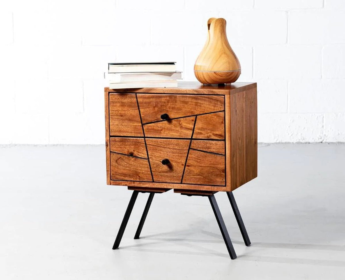 Barcelona Solid Wood Two Drawer Bedside Table is a perfect solid wood Bedside Table. Use of Acacia Wood as primary material gives this Bedside Table a solid & sturdy look. Secondary material is used as Powder Coated Metal Legs & MDF is used in the Backside & Drawer Bottom. We offer free country-wide shipping and free installation service. The wood used in the furniture is perfectly seasoned for optimum moisture content, to reduce the possibility of seasonal expansion or contraction of the products.