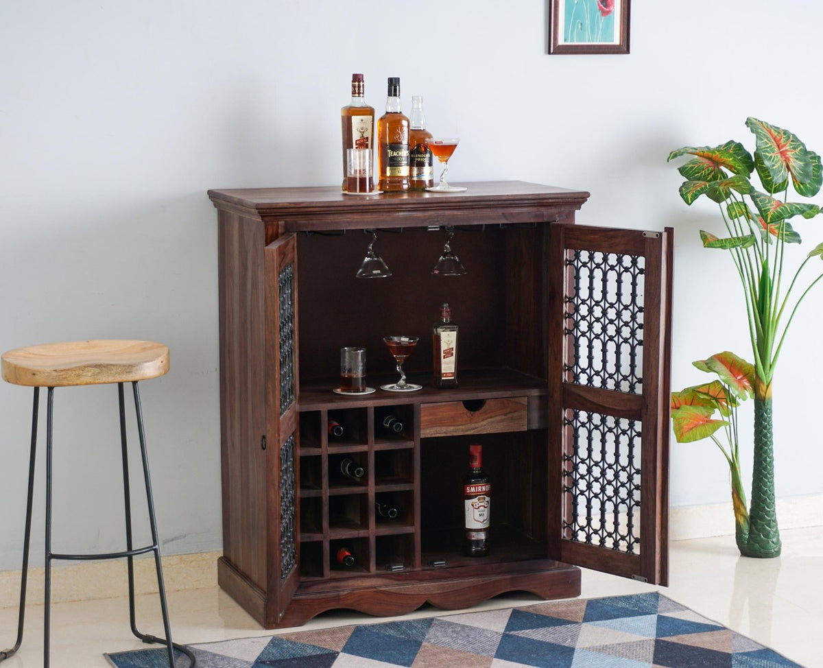 Sweden Sheesham Wood Bar Cabinet is a perfect solid wood . Use of Sheesham Wood as primary material gives this a solid & sturdy look. Secondary material is used as Powder Coated Metal Jali , MDF is used in the Drawer Bottom & Backside. We offer free country-wide shipping and free installation service. The wood used in the furniture is perfectly seasoned for optimum moisture content, to reduce the possibility of seasonal expansion or contraction of the products.