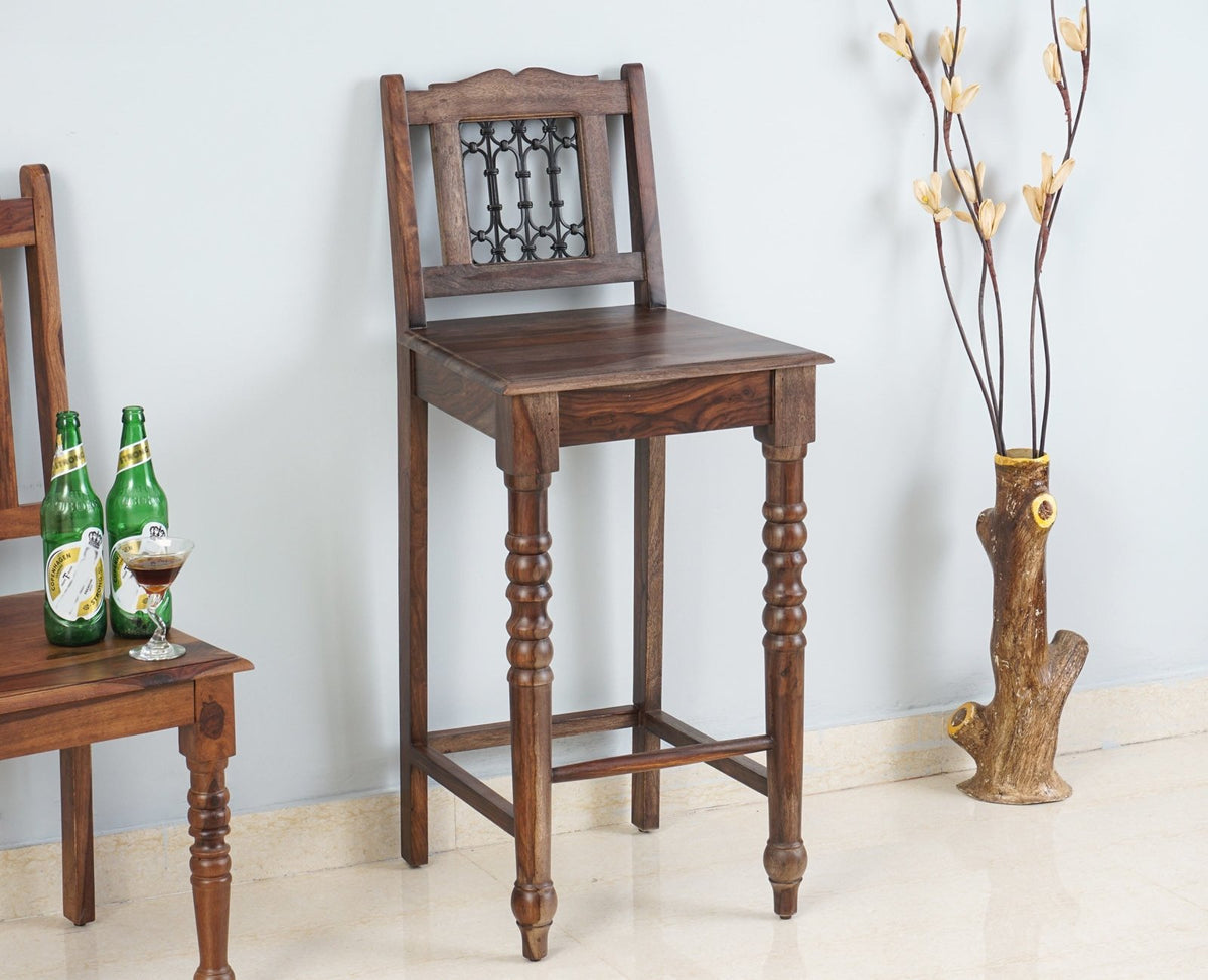 Sweden Sheesham Wood Bar Chair is a perfect solid wood . Use of Sheesham Wood as primary material gives this a solid & sturdy look. Secondary material is used as Powder Coated Metal Jali. We offer free country-wide shipping and free installation service. The wood used in the furniture is perfectly seasoned for optimum moisture content, to reduce the possibility of seasonal expansion or contraction of the products.