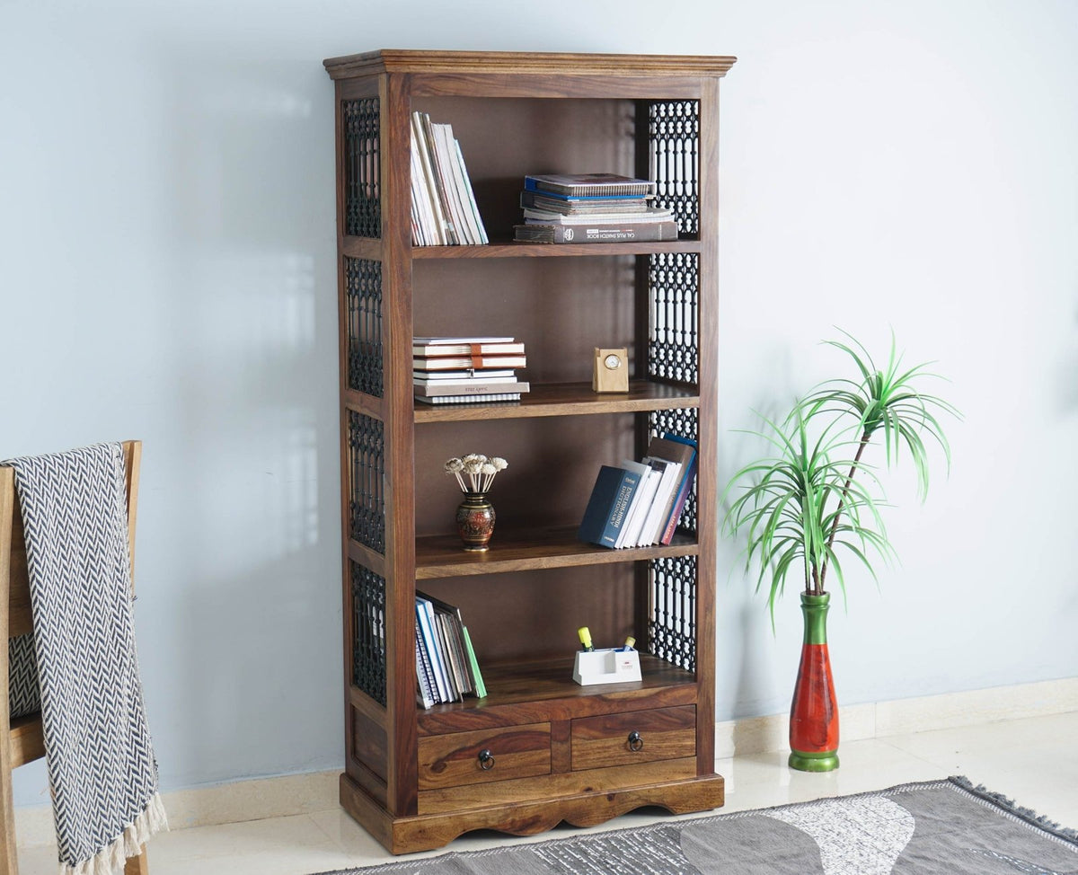Sweden Sheesham Wood Open Bookshelve is a perfect solid wood Bookshelf. Use of Sheesham Wood as primary material gives this Bookshelf a solid & sturdy look. Secondary material is used as Powder Coated Metal Jali , MDF is used in the Backside. We offer free country-wide shipping and free installation service. The wood used in the furniture is perfectly seasoned for optimum moisture content, to reduce the possibility of seasonal expansion or contraction of the products.