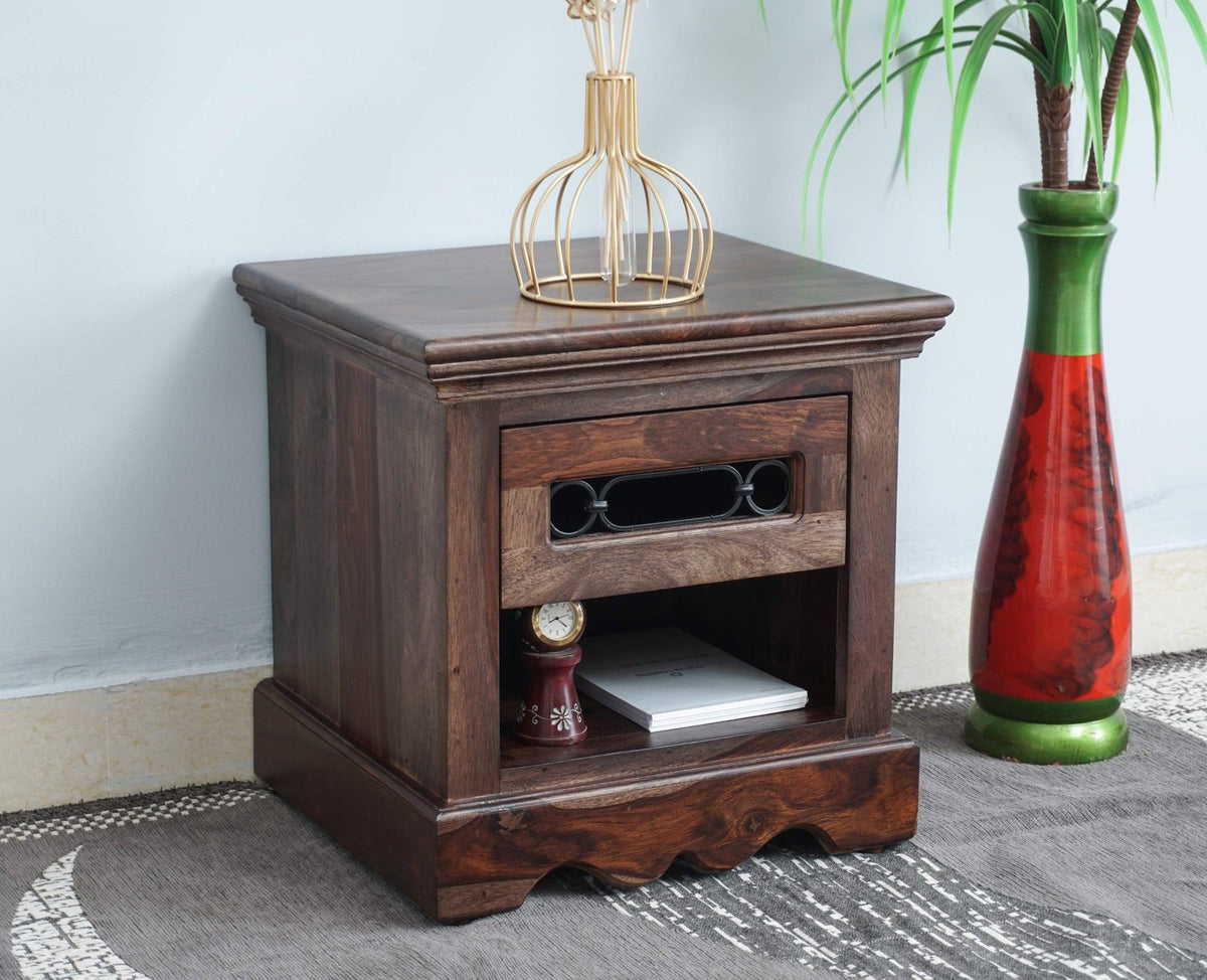 Sweden Solid Wood Bedside Table is a perfect solid wood . Use of Sheesham Wood as primary material gives this a solid & sturdy look. Secondary material is used as Powder Coated Metal Jali & MDF is used in the Drawer Bottom & Backside. We offer free country-wide shipping and free installation service. The wood used in the furniture is perfectly seasoned for optimum moisture content, to reduce the possibility of seasonal expansion or contraction of the products.
