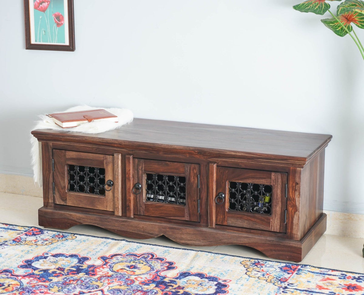 Sweden Solid Wood Three Doors Bench Shoe Rack is a perfect solid wood . Use of Sheesham Wood as primary material gives this a solid & sturdy look. Secondary material is used as Powder Coated Metal Jali , MDF is used in the Backside. We offer free country-wide shipping and free installation service. The wood used in the furniture is perfectly seasoned for optimum moisture content, to reduce the possibility of seasonal expansion or contraction of the products.