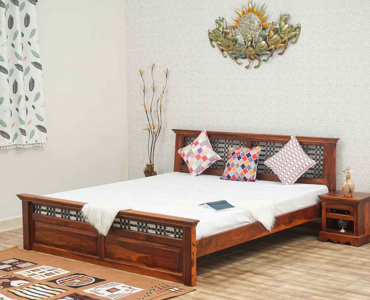 Material: Primary - Sheesham Wood, Secondary - Powder Coated Metal Jali , MDF used at bottom of the mattress