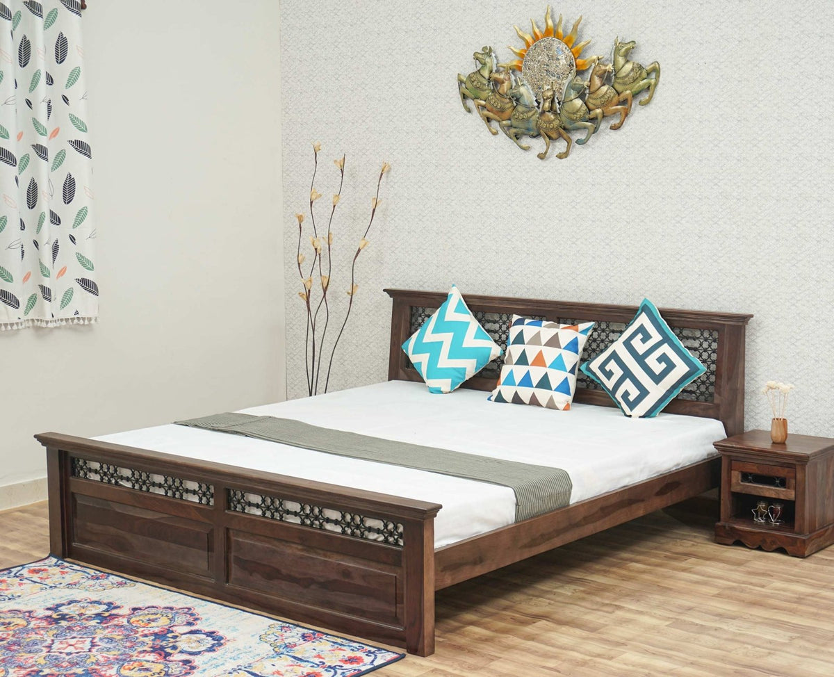 Material: Primary - Sheesham Wood, Secondary - Powder Coated Metal Jali , MDF used at bottom of the mattress