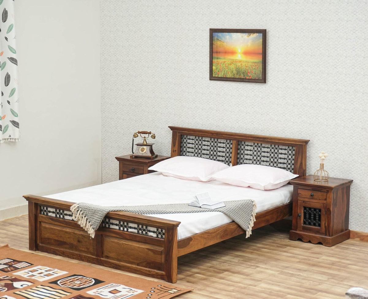 Material: Primary - Sheesham Wood, Secondary - Powder Coated Metal Jali , MDF used at bottom of the mattress