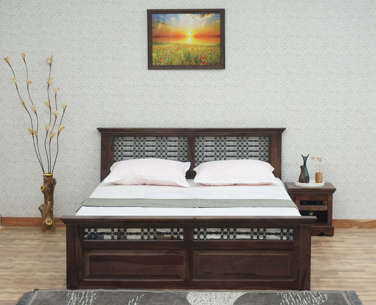 Material: Primary - Sheesham Wood, Secondary - Powder Coated Metal Jali , MDF used at bottom of the mattress