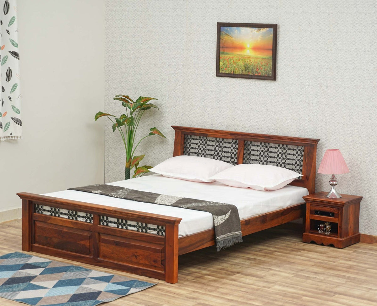 Material: Primary - Sheesham Wood, Secondary - Powder Coated Metal Jali , MDF used at bottom of the mattress