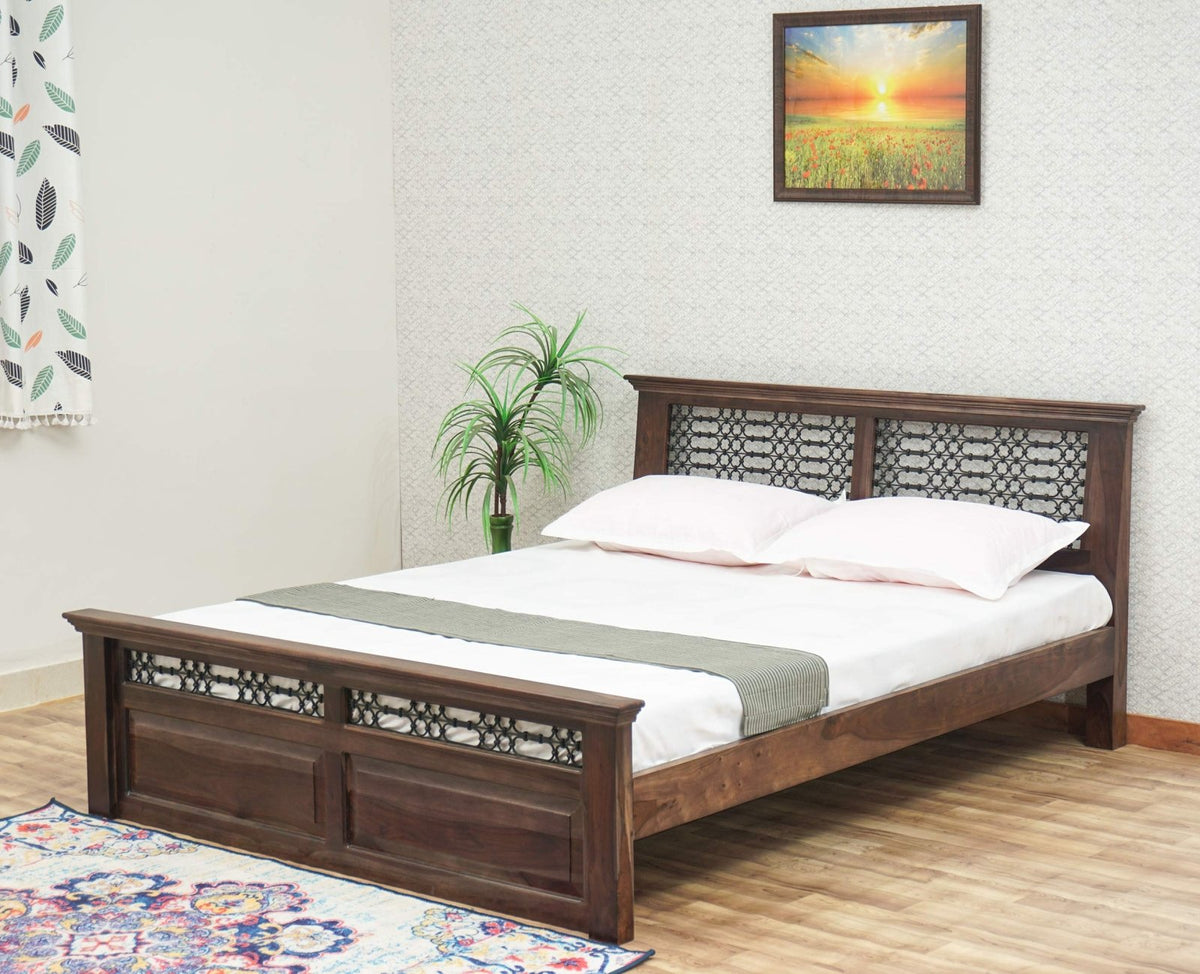 Material: Primary - Sheesham Wood, Secondary - Powder Coated Metal Jali , MDF used at bottom of the mattress