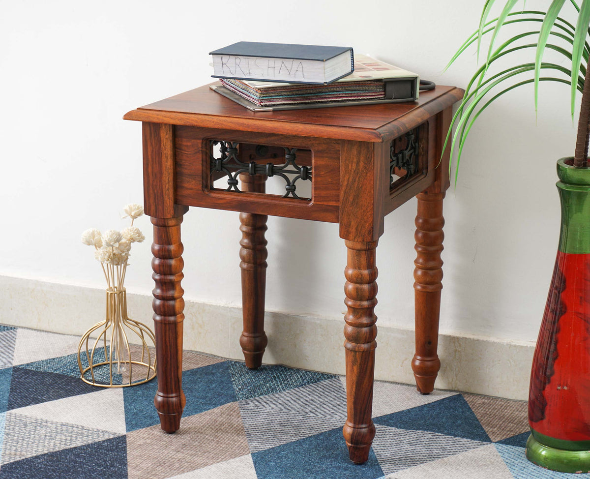 Sweden Solid Wood Side Table is a perfect solid wood . Use of Sheesham Wood as primary material gives this a solid & sturdy look. Secondary material is used as Powder Coated Metal Jali. We offer free country-wide shipping and free installation service. The wood used in the furniture is perfectly seasoned for optimum moisture content, to reduce the possibility of seasonal expansion or contraction of the products.