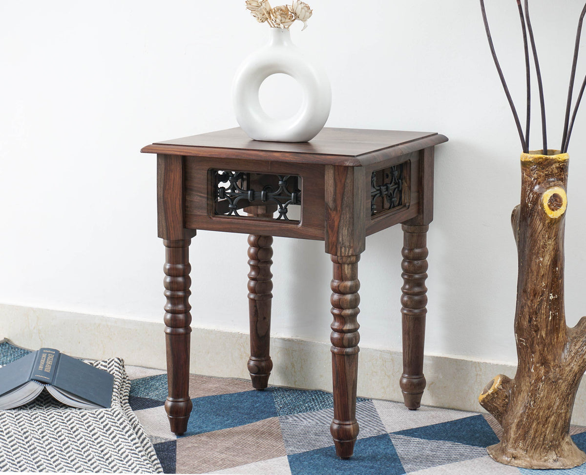 Sweden Solid Wood Side Table is a perfect solid wood . Use of Sheesham Wood as primary material gives this a solid & sturdy look. Secondary material is used as Powder Coated Metal Jali. We offer free country-wide shipping and free installation service. The wood used in the furniture is perfectly seasoned for optimum moisture content, to reduce the possibility of seasonal expansion or contraction of the products.