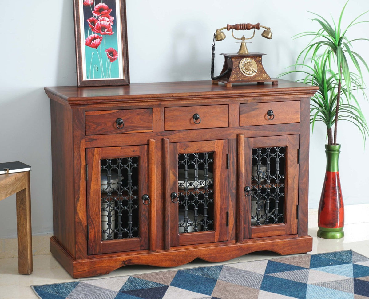 Sweden Solid Wood Three Doors Sideboard Cabinet is a perfect solid wood . Use of Sheesham Wood as primary material gives this a solid & sturdy look. Secondary material is used as Powder Coated Metal Jali & MDF is used in the Drawer Bottom & Backside. We offer free country-wide shipping and free installation service. The wood used in the furniture is perfectly seasoned for optimum moisture content, to reduce the possibility of seasonal expansion or contraction of the products.