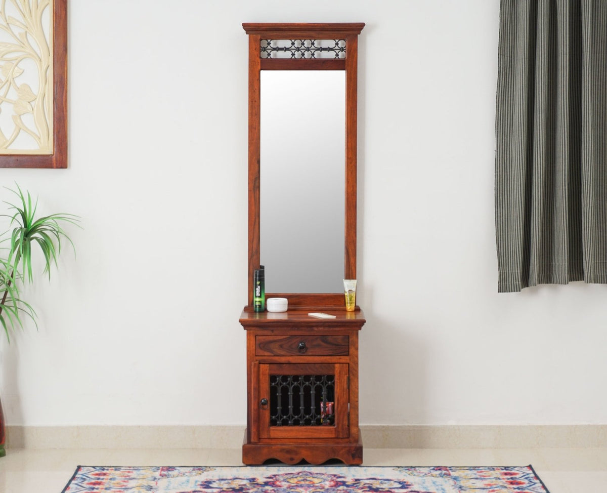 Sweden Wooden Dressing Table is a perfect solid wood . Use of Sheesham Wood as primary material gives this a solid & sturdy look. Secondary material is used as Powder Coated Metal Jali , MDF is used in the Drawer Bottom & Backside. We offer free country-wide shipping and free installation service. The wood used in the furniture is perfectly seasoned for optimum moisture content, to reduce the possibility of seasonal expansion or contraction of the products.