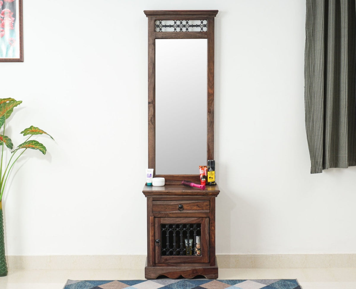 Sweden Wooden Dressing Table is a perfect solid wood . Use of Sheesham Wood as primary material gives this a solid & sturdy look. Secondary material is used as Powder Coated Metal Jali , MDF is used in the Drawer Bottom & Backside. We offer free country-wide shipping and free installation service. The wood used in the furniture is perfectly seasoned for optimum moisture content, to reduce the possibility of seasonal expansion or contraction of the products.