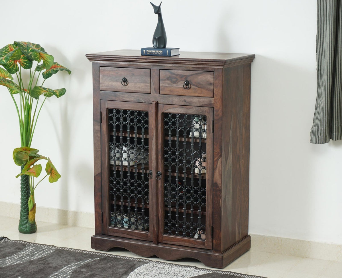 Material: Primary - Sheesham Wood, Secondary - Powder Coated Metal Jali , MDF is used in the Drawer Bottom & Backside